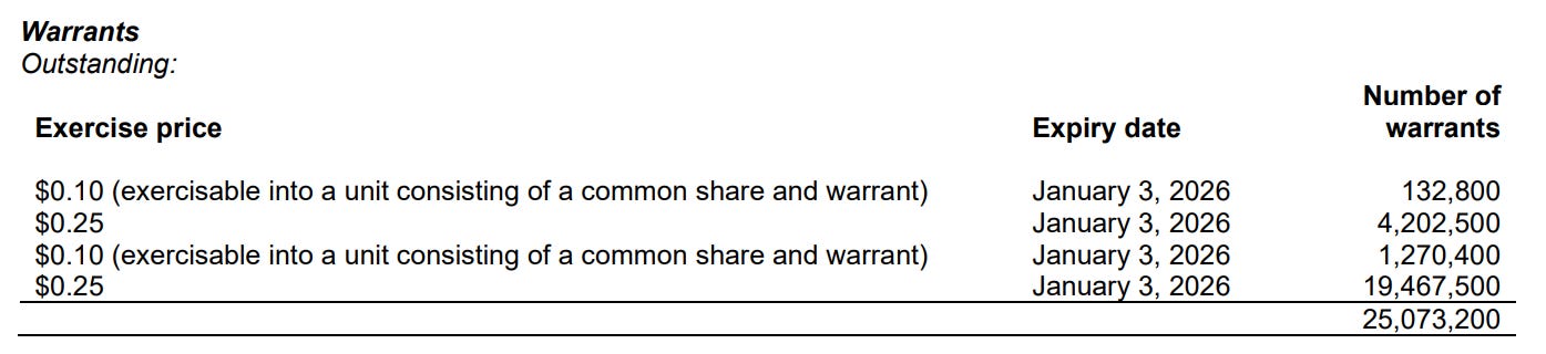 25 million warrants are set to expire on January 3. There are four trading days left before these warrants expire. The $0.10 strike warrants are well in the money and are likely to get exercised. But they amount to only 1.4 million units. The majority of the warrants have a strike price of $0.25.
