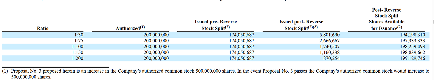 Strike three comes with the recent proxy statement and subsequent approval of all proposals at the special meeting held last week. The proxy statement outlines the mess of toxic and convertible financings that took place to try to clean up the balance sheet that led to the ballooning share count. I’m not going to get into it all, I’ll just summarize it by saying it’s bad for shareholders. But the approved proposals tell you where the stock price is really headed in the not-too-distant future. First, a reverse split between 1-for-30 and 1-for-200 will take place some time on or before March 15, 2026. This is par for the course as the company tries to get its shares relisted on the NASDAQ. However, in addition to the reverse split, the authorized share count will increase from 200 million to 500 million. The company made it very clear as outlined in this chart below that the reverse split will NOT reduce the amount of authorized shares: